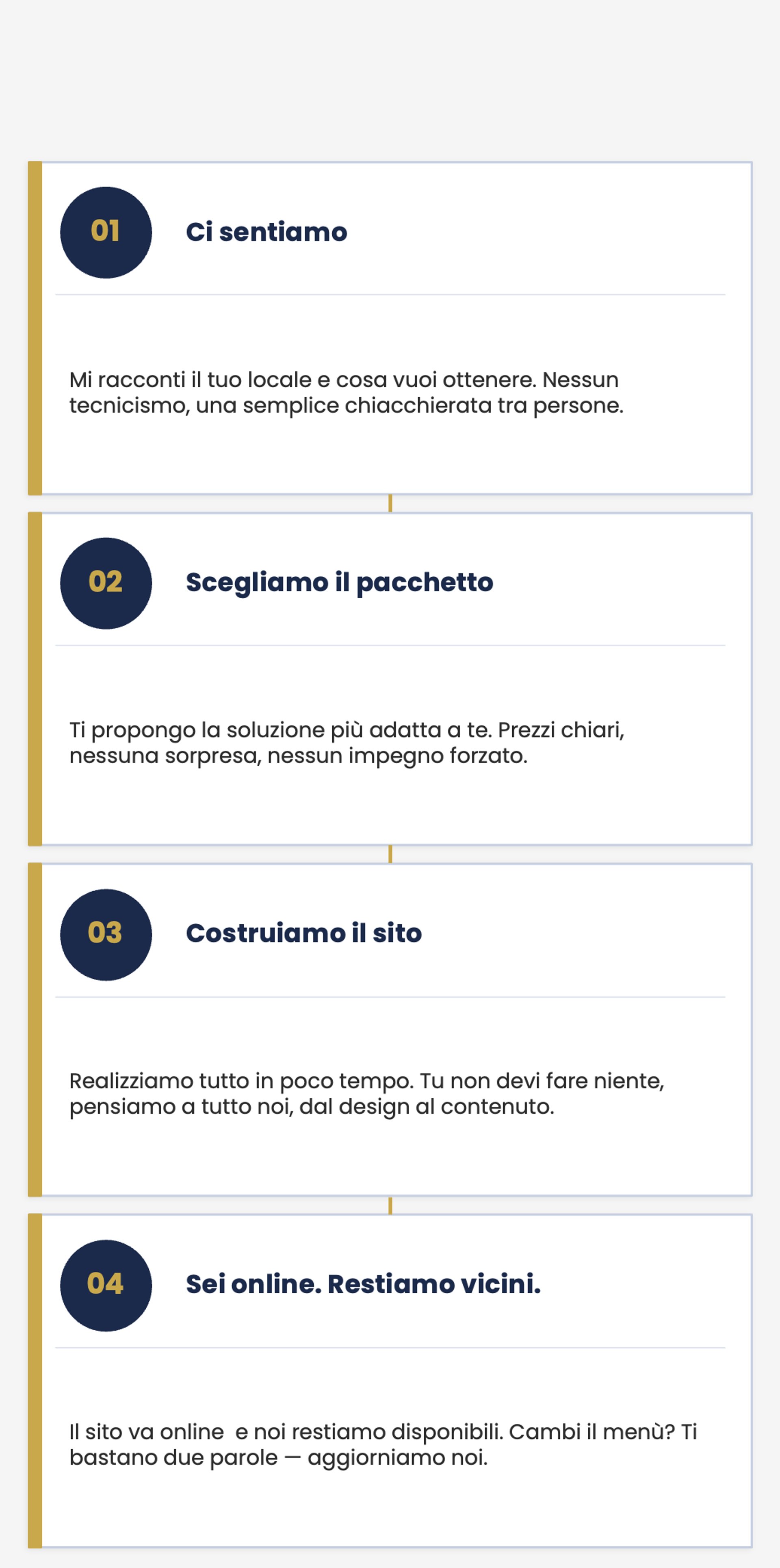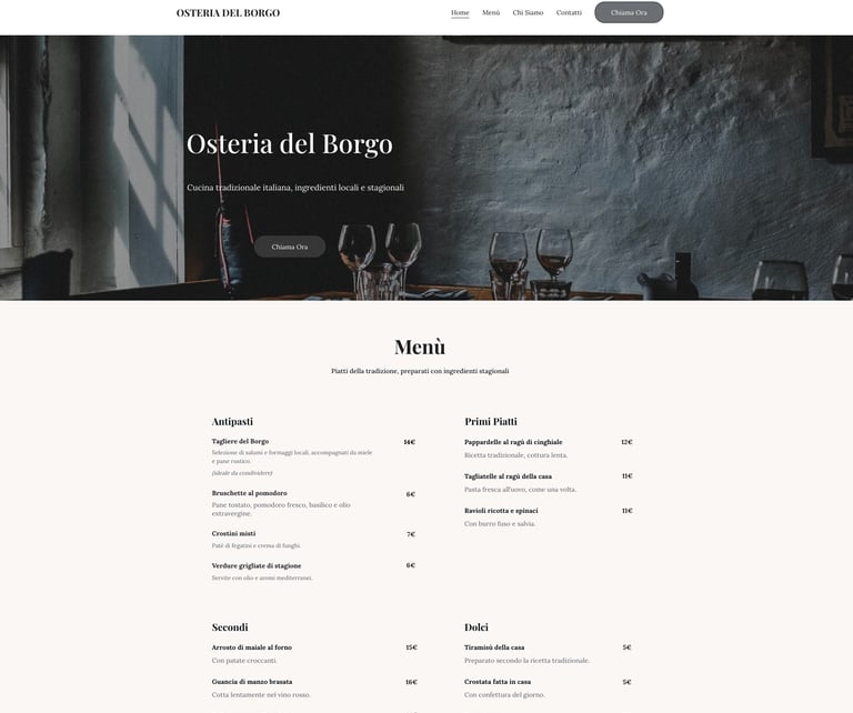 Il canone mensile include: hosting, dominio gestito da noi e aggiornamenti base (piccole variazioni di menù, orari, vini, foto). Nessun pensiero per te.